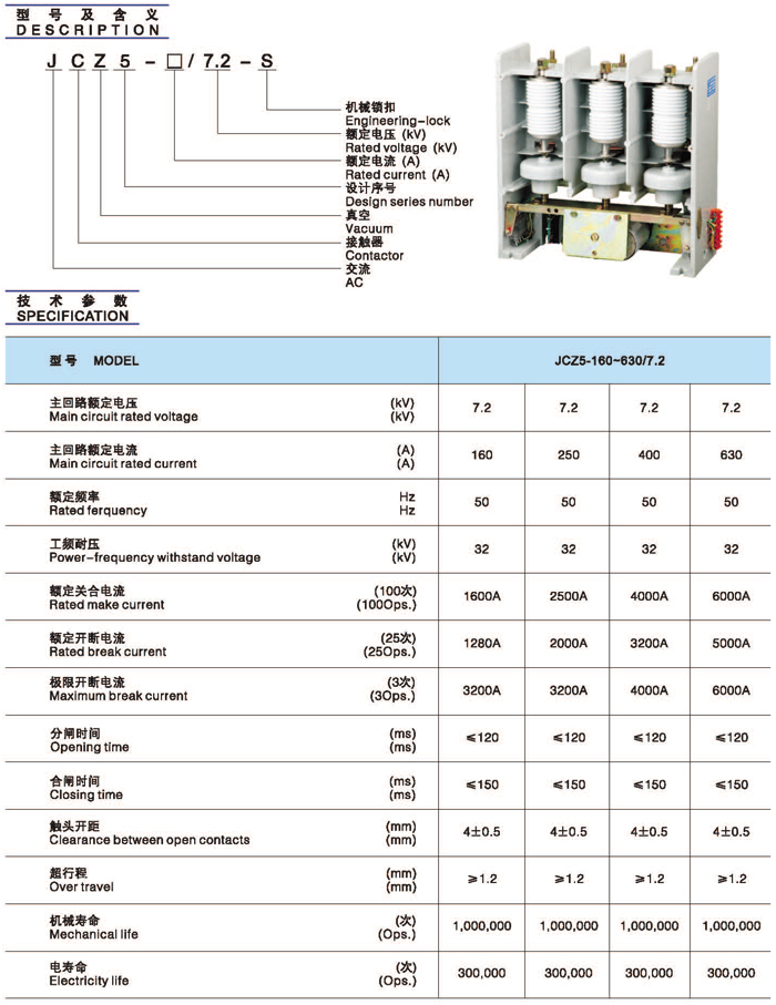 JCZ5-160/7.2-S,沪远,HY,JCZ5系列真空接触器